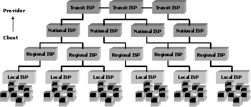One answer to this conundrum has been to use a simpler model of interconnection, where one ISP is the supplier and the other ISP is the customer. In this model of interconnection the flow of money across the interconnection is in a single direction as the client pays the provider for an Internet connection service. Simple models that scale quickly are well suited to the internet, and we have seen quite widespread adoption of this supplier / customer interconnection model. The outcome of this is the creation of a number of levels of hierarchy within the Internet, where local ISPs are customers of larger regional ISPs, who in turn may be customers of larger national ISPs, who in turn may be customers of international transit ISPs. This structured view of ISP interconnection is shown in Figure 1. The structure is often referred to as a 'tiered' model, where the ISPs at the top level of the hierarchy are referred to as "Tier 1 ISPs", customer of these ISPs are referred to as "Tier 2 ISPs", and so on.
