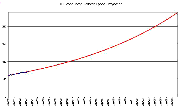 And, again using the same set of assumptions about the underlying growth model, where the growth in the total advertised address space is proportional to the size of the advertised address pool, extrapolate forward.