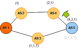 As the routing advertisement is propagated across the inter-domain space each prefix accumulates an associated “AS Path”. As a prefix advertisement transits each domain, the domain effectively “signs” the prefix advertisement by having its AS number prepended to the AS Path associated with the address prefix. At any point in the network the AS path describes a sequence of connected domains which forms a path from the current point to the originating domain. This is shown in Figure 1, where AS 1 originates an advertisement for the address prefix 192.0.2.0/24. At AS 5, the AS will receive two BGP advertisements for this prefix. One will have the AS Path (4,2,1), while the other will have the AS Path (3,1). The AS Path is a sequence of AS number values. The left-most number is the AS number of the adjacent Autonomous System from which the address prefix advertisement was received. The sequence of numbers indicates the sequence of Autonomous Systems though which this update was propagated. The right-most, or final AS number is the AS number of the Autonomous System that originated the address prefix advertisement, or “