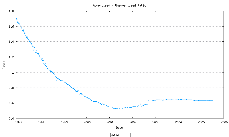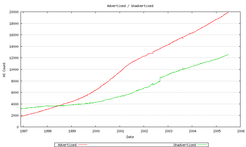 This figure indicates that since 2003 the rate of growth of unadvertised AS’s is slightly lower than the growth rate of advertised ASs.
