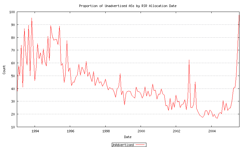 Interestingly the older AS number blocks appear to have a much higher amount of unadvertised ASs than more recent AS number blocks. Another way to look at his is to examine the age distribution of