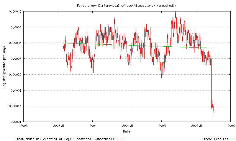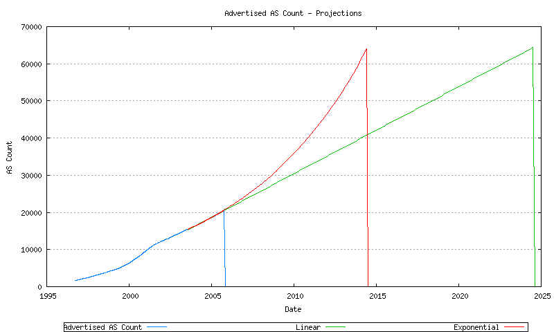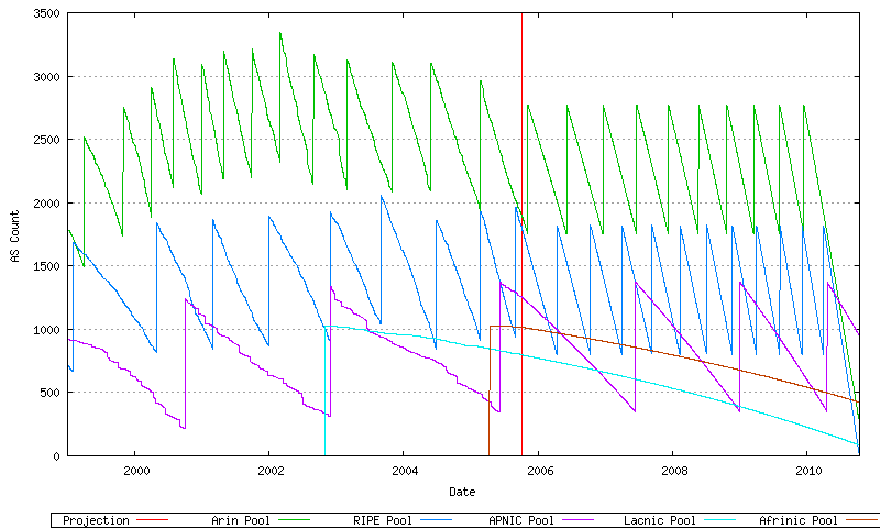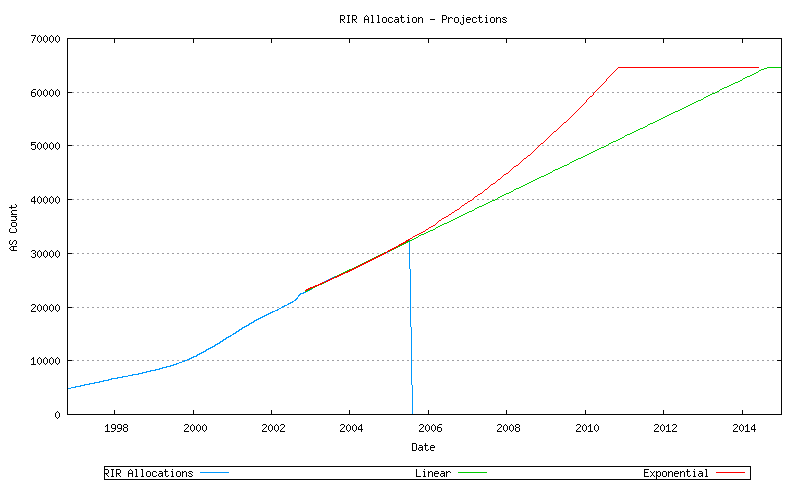 At this point is now possible to make some projections on AS number consumption. The technique here is to use the available data from a starting point of the start of 2003 and using a least squares best fit to the data generate trend data series. This trend data is then projected forward in time to forecast the point in time when the resource reaches a certain threshold point.