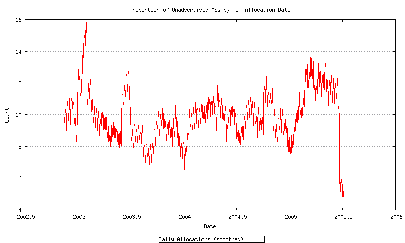 These allocated AS’s are then assigned to ISPs by the RIRs, and a second time series can be generated, showing the rate of AS assignment to ISPs and Local Internet Registries. This allocation time series is shown in Figure 7. Again the series shows the effects of the Internet boom across the period from 1999 through to late 2001. The subsequent market correction is also evident, which was visible in the AS allocation rate change by early 2002.