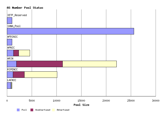 While some 38,910 AS numbers have been allocated by IANA, there is a further classification of AS numbers. A working pool of numbers is held by the RIR for subsequent assignment to ISPs. Of the assigned AS numbers some are visibly used in the inter-domain routing table of the public Internet, while others are not visible in the Internet. The breakdown of AS numbers into the RIR pool, assigned but not advertised, and assigned and advertised, as of July 2005, is shown in Figure 3. Of the 32,557 assigned AS numbers, some 19,859 are advertised, while 12,698 have been allocated in the past, but are not currently advertised in the BGP routing table.