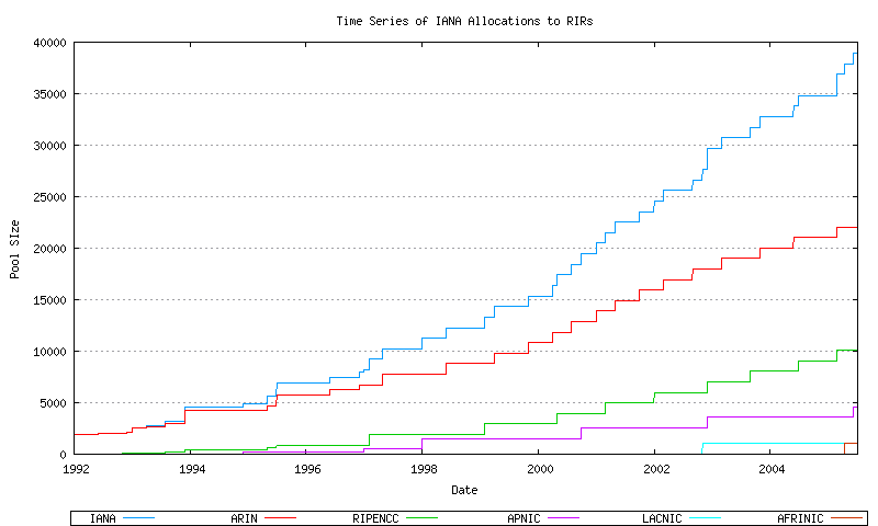 It is also possible to construct a number of time series of the AS allocation data, showing the growth in the use of AS numbers over the past decade or so. The first of these series is the allocation of blocks of AS numbers from IANA to the RIRs, shown in Figure 5.
