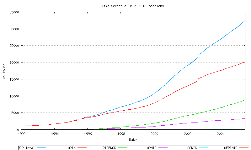 It is evident that the rate of AS allocation was highest in the ARIN region across the Internet boom of 1999 – 2002, while more recent allocation activity is evident in the European region of the RIPE NCC.