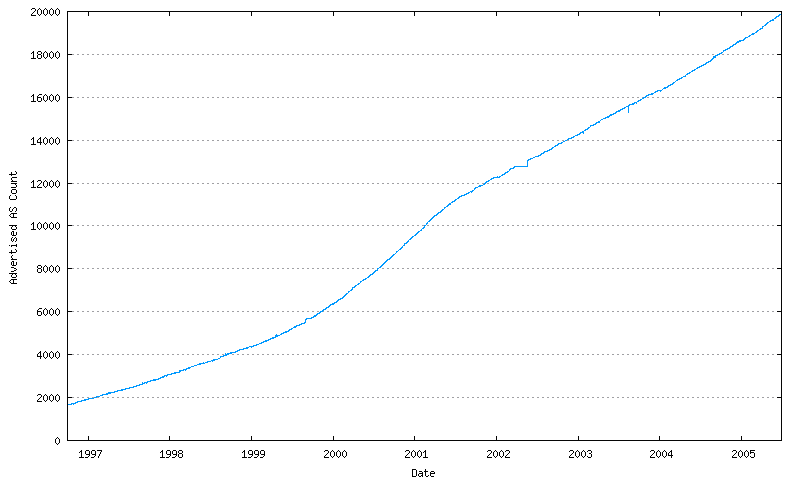 The current count of advertised AS numbers is some 20,000, as of July 2005. This time series has a visible correlation to the recent Internet business cycles, with a sharp upward trend across the Internet boom period of 1999 – 2001, and a marked change in the trend in early 2001. Since that date the rate of increase of AS numbers has been far slower.