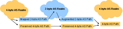 The general approach adopted for transition is preserve AS Path length information across the OLD and NEW BGP boundaries, while recognising that some 4-byte AS information cannot be cleanly mapped into a 2-byte AS Path. In order to preserve 4-byte information, which is necessary to prevent loop formation for 4-byte AS’s, the 4-byte information is preserved across OLD transit paths and restored upon re-entry into NEW BGP realms.