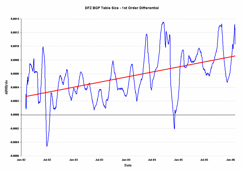 However the IPv4 trends for 2005 are a source of some concern. How big can the Internet grow in the coming years? Will we continue to be able to deploy routers in the default-free routing zone of the Internet that can comfortably route the Internet. Can we add additional functionality into the routing system and still stay within comfortable limits of the capability of the routing system and the routers? If you are an ISP and are considering purchasing new 'core' routers what capabilities should you specify for an operational lifetime of 2 years? How about for the next 5 years? And if you are a router vendor designing routing products for the market 3 or 5 years in the future what capacity should you build into the router? How much processing capacity should you plan for to support default-free BGP? How much memory is necessary?