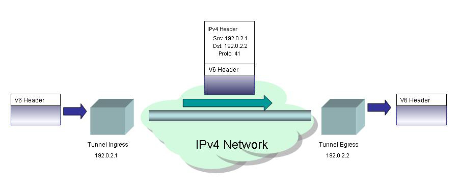 The simplest form of tunnelling IPv6 packets over an IPv4 network is the IP-in-IP approach. Here an IPv6 packet is simply prefixed by a 20 octet IPv4 packet header. In this IPv4 packet header there is the source address is the IPv4 address of the tunnel ingress, the destination address is the IPv4 address of the tunnel egress and an IP protocol field with the value 41, indicating that the payload is an IPv6 packet. The packet is passed across the IPv4 network from tunnel ingress to egress using conventional IPv4 packet forwarding, and at the egress point the IPv4 IP packet header is removed and the IPv6 packet is routed in an IPv6 network as before. From the IPv6 perspective the transit across the IPv4 network is a single logical hop.