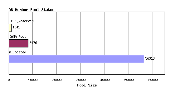 There are 65536 AS numbers in the 16 bit number pool. 1,041 numbers are reserved by the IETF for private use and documentation purposes, and one number, AS 23456, is reserved for protocol use. Of the remaining 64,494 AS numbers, As of the end of August 2009, some 56,318 AS numbers have been passed into the system managed by the Regional Internet Registries, and 8,176 AS numbers remain with the IANA.