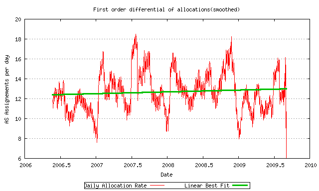 While there has been some significant short term variation (or "jitter') in the daily allocation rate of AS Numbers, from a low point of 8 ASNs per day to a high of 18 ASNs per day, the long term trend is an average of some 12.5 ASNs per day, with a slight increase over this 38 month period.