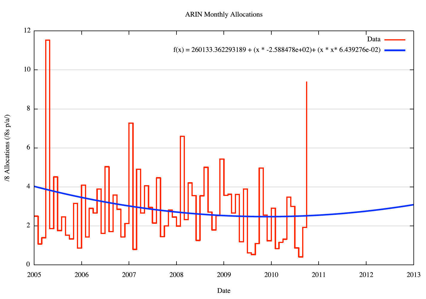 If we want to understand when we are going to run down the address pool then we are not looking at the average of some 7,000 individual allocations per year, but the likely timing of the largest 20 or so transactions each year, and in the time remaining between now and exhaustion of the pool we are looking at the timing of the next 10-20 such large transactions, as they will effectively determine the date when the available address pool is exhausted.