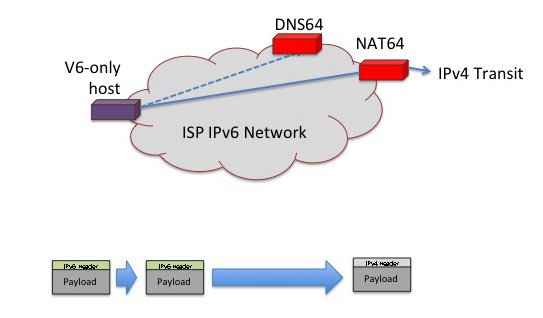 Not unsurprisingly, NAT-PT is undergoing a revival, this time under the name "NAT64." Not much has changed from the basic approach outlined in NAT-PT. The IPv6-only client performs a DNS lookup through a modified DNS server that is configured with DNS64. IN the case that the queried name only contains an IPv4 address, the DNS64 server synthesises an IPv6 response by merging the prefix address of the NAT64 gateway with the IPv4 address. When the client uses this address, the IPv6 packet is directed to the NAT64 gateway, and the same transform as described above for NAT-PT takes place.