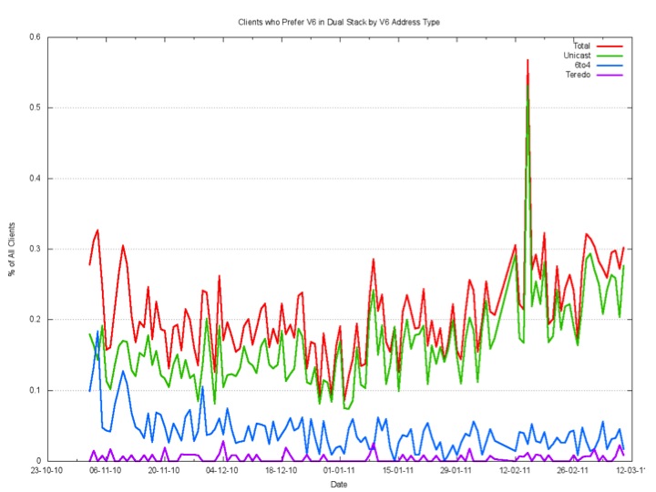 How much Teredo is being used? When we look at the clients who prefer to use IPv6 in a Dual Stack situation, Teredo is quite uncommon.
