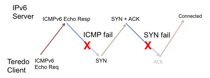 This 37% figure for is a lower bound on the failure rate, as it does not include any consideration of the failure of the initial Teredo exchange with a Teredo server that attempts to match the client with a Teredo Server and establish the client's NAT behaviour type, nor does in include consideration of any failure of the client's ICMPv6 ICMP Echo Request to reach the server.