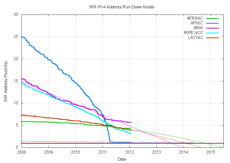 I suspect this is due to a combination of two factors: namely the exhaustion of IPv4 address space in the fastest growing sector of the market in the regional market of Asia, and the long-standing economic malaise that has impacted much of the European and North American markets over 2011. The relationship between address allocations and overall economic activity is a direct one, as the deployment of new services into the consumer market calls for an associated investment in infrastructure and related services,. The constraints on capital borrowings over the past couple of years, and over 2011 in particular has impacted the rate of expansion of the Internet in 2011.