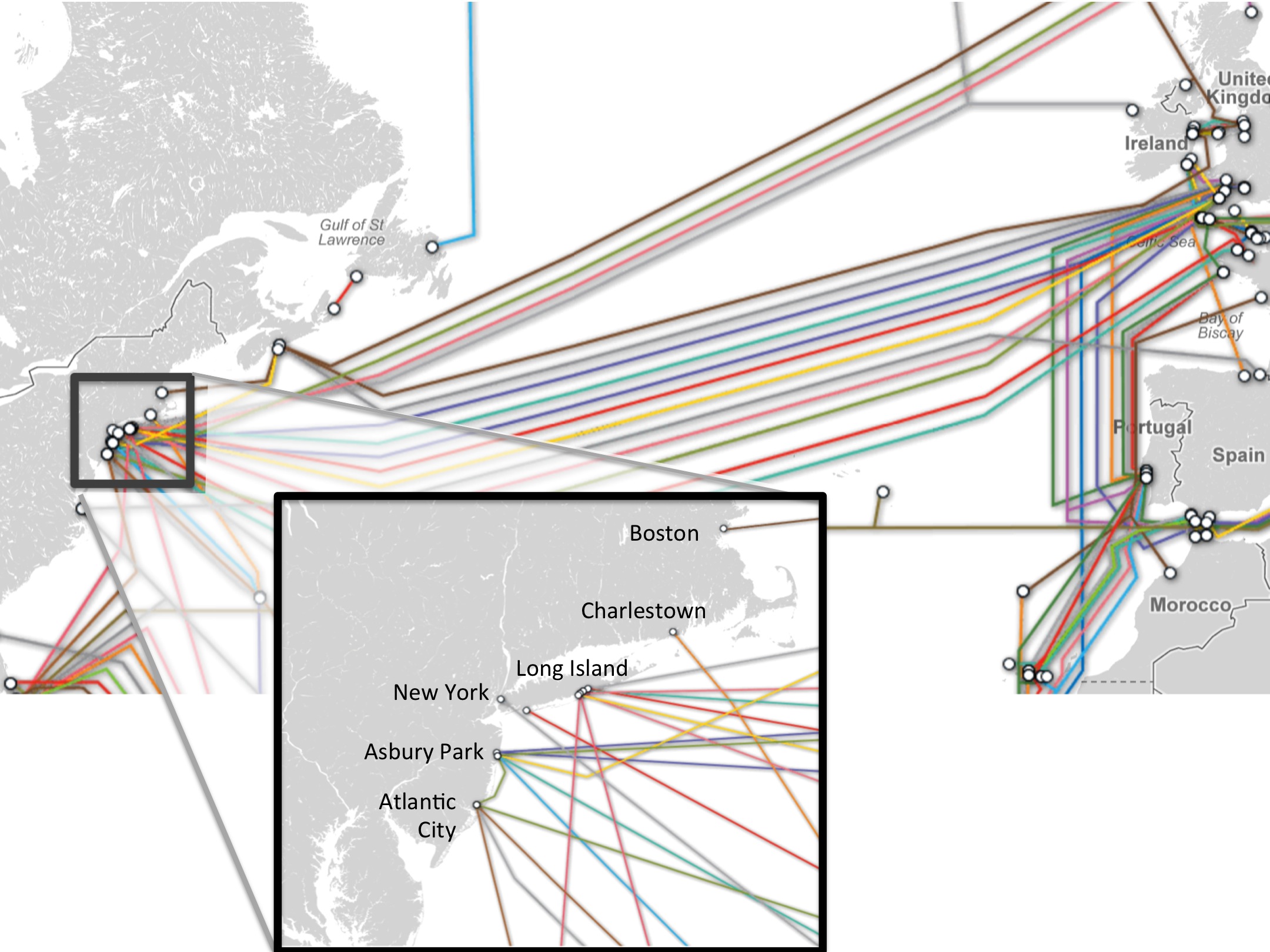 If you compare these two figures, looking at the storm's landfall and the map of submarine cables and their landing points, then it's evident that Sandy's impact was directly aligned with the landfall points of some 25 submarine cable systems on the New Jersey and New York shores.