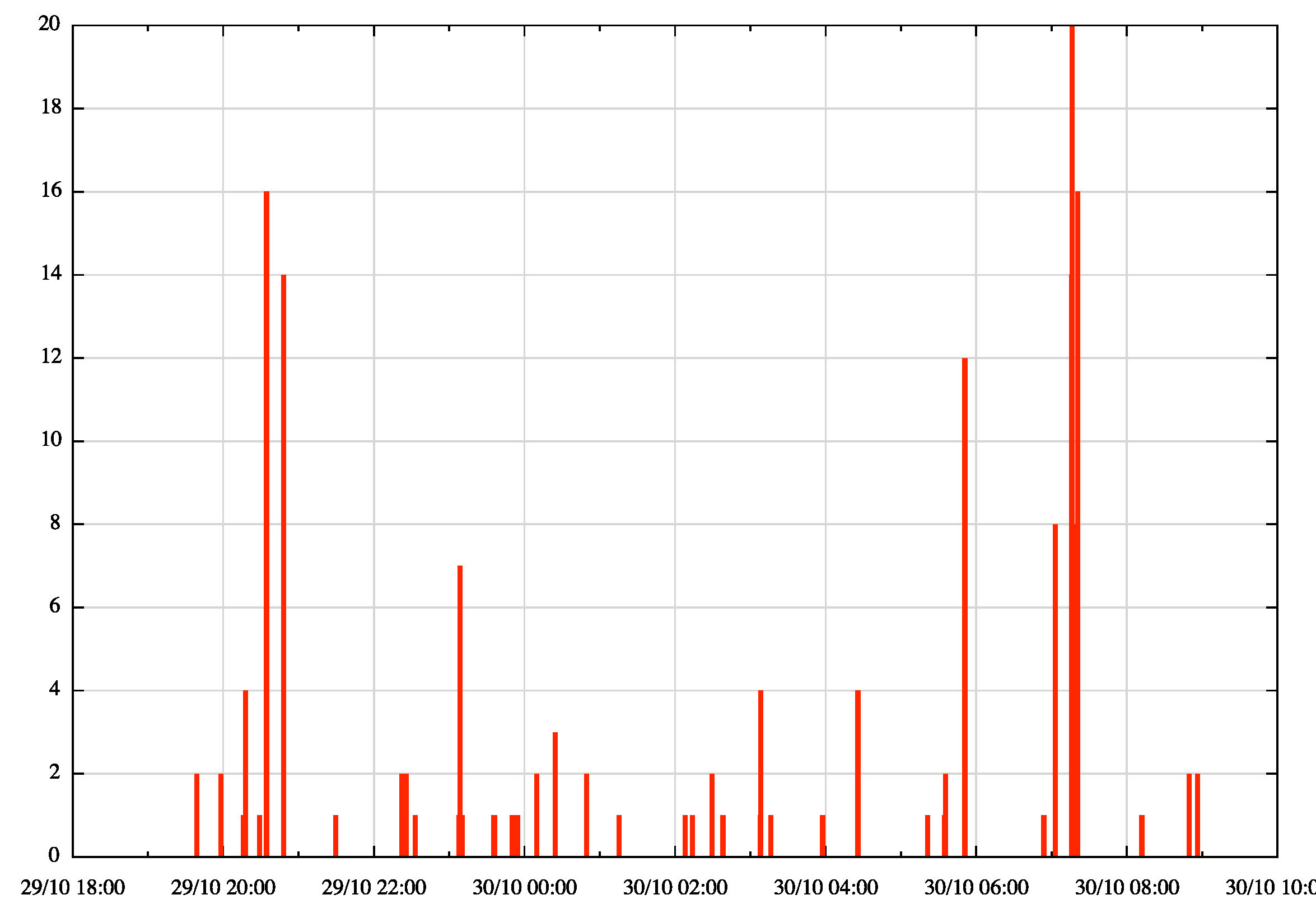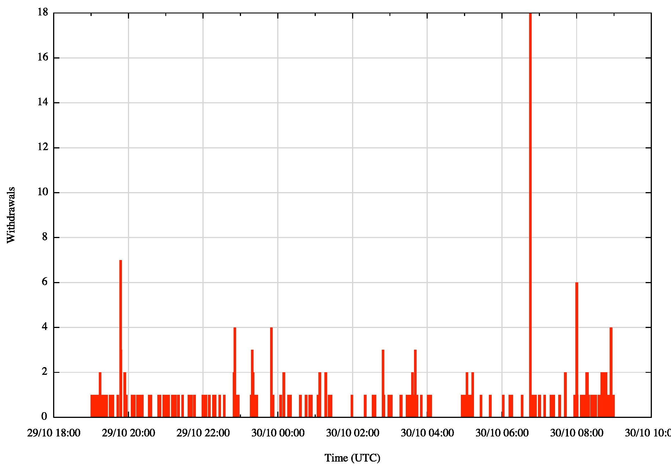 As this is a second-by second view based on the recorded BGP updates, its possible to bring into sharper focus the time period around Sandy's landfall at midnight UTC (Figure 5). Interestingly, apart from the route reset, there is no immediately obvious single timeframe where many hundreds of networks were withdrawn in a single event, which tends to suggest that there was no large scale loss of a set of networks that exclusively use the facilities in New York for transit.