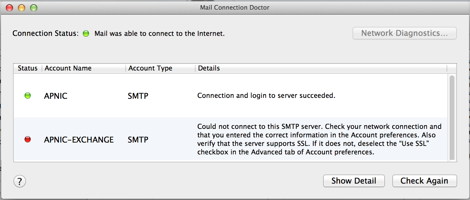 The first task was to find a set of circumstances where I could reliably find failure. In the last week of February I attended the APRICOT conference in Singapore, and I found that the conference network was consistent. Whenever I used the conference network my mail client was unable to send outgoing mail.