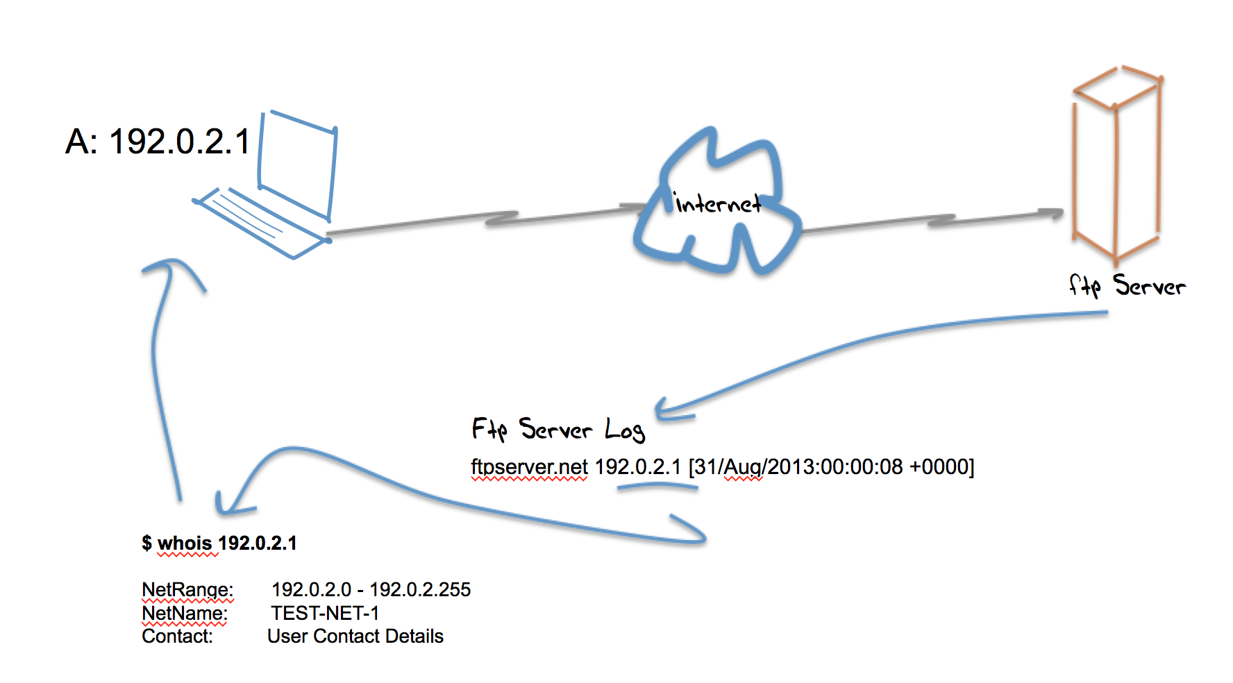 We can start by looking at the Internet while it was still largely a research project, well before it assumed any role as a public communications utility, which would correspond to the late 1980’s or thereabouts. In that architecture of the network the IP address of a connected device was its identification “key”. If a ftp server logged the IP addresses of the clients who used its services, then this IP address would be sufficient to traceback to the end device. The essential information required to complete the traceback was the IP address registry data, that recorded the identity and contact details of the end user entity who received the address allocation.