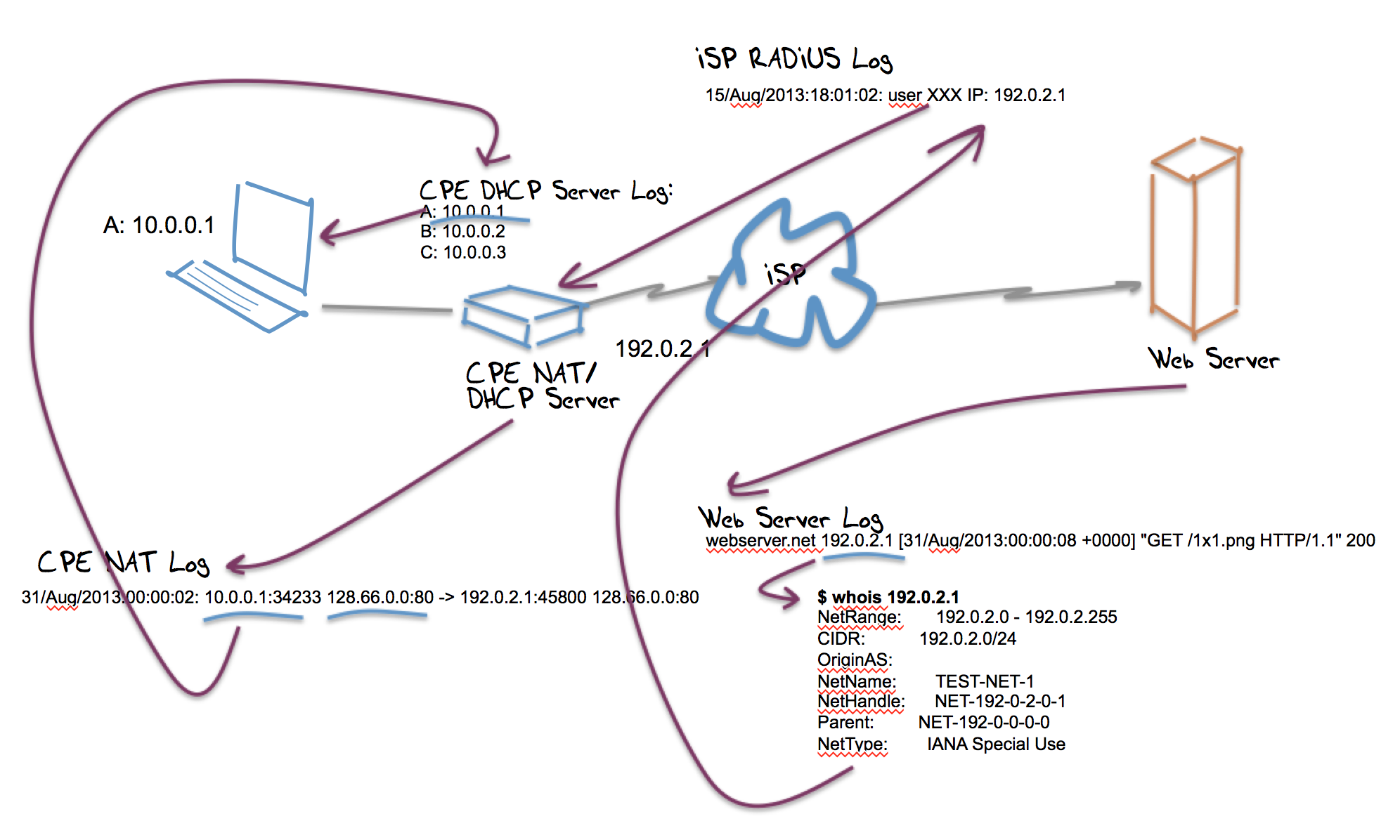 Addresses are not registered against the edge network and not used individually used to identify host devices. In other words, addresses are no longer stable endpoint identifiers. The implication is that additional information is required to perform a reconstruction of the association of the address to an individual end device. The major additional information required to perform this traceback is the time of day, used in conjunction with the IP address as a lookup into the service provider’s dynamic address configuration logs.