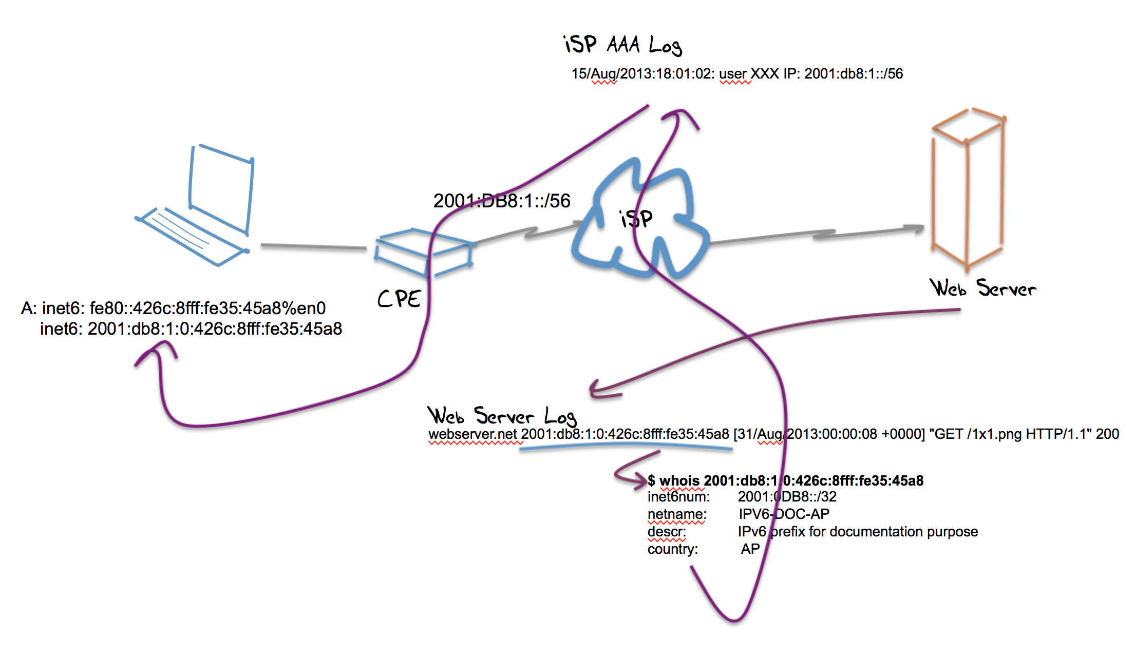 The original intention in IPv6 was to revert to a simpler network architecture that is more closely aligned to that of the original IPv4 Internet, where individual IPv6 addresses are uniquely associated with an end device. The addressing plan in IPv6 is still aligned to service providers so the registry entry for the address will still point to the service provider, and the service provider’s logs will be needed to map the address to a site prefix that has been assigned to an end customer.