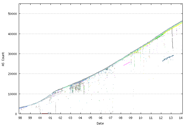 BGP is a distance vector routing protocol. This family of routing protocols operates through an iterative process where every BGP speaker informs all neighbouring BGP speakers of its selected best path to a destination. When a BGP speaker obtains an update from its neighbor, it compares the updated information with its current selected best path, and if this information causes the local BGP instance to select a new best path, then it informs its neighbours of this new choice. BGP, like all distance vector routing protocols, can be a very chatty protocol, and the larger the population of BGP speakers, and the denser the level of inter-connectivity between BGP speakers, the greater the potential amount of protocol updates that will occur across the network before it converges to a coherent common state. And of course as the Internet grows, this precisely what is happening to BGP. More Autonomous Systems are being added to the routing system, and the level of interconnectedness continued to rise, as evidenced by the relatively stable position of the average AS path length over time.