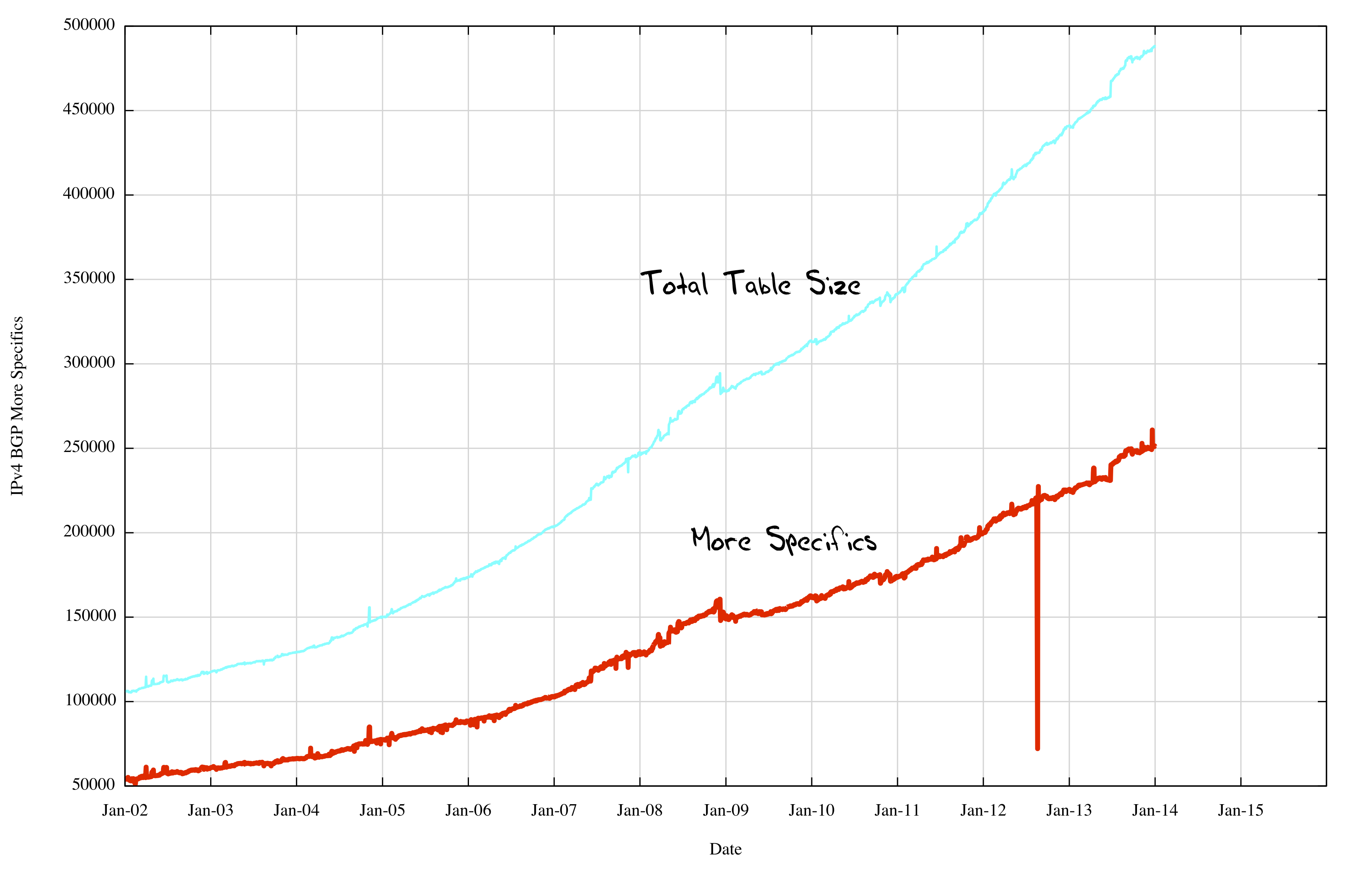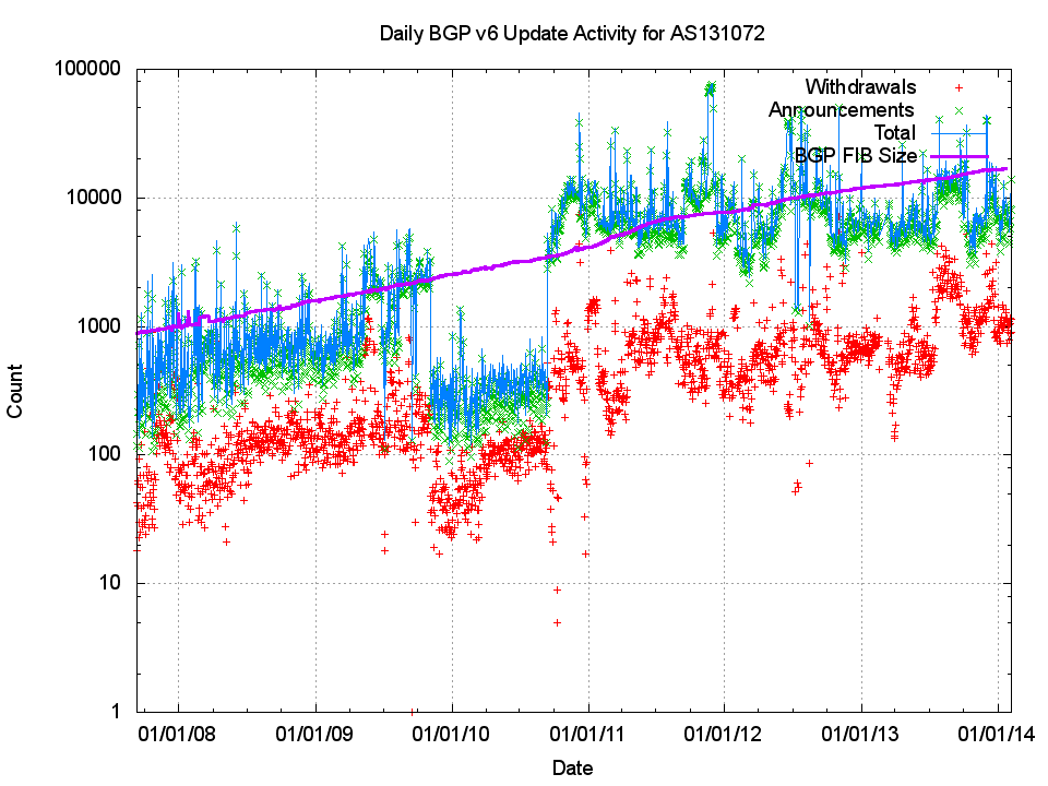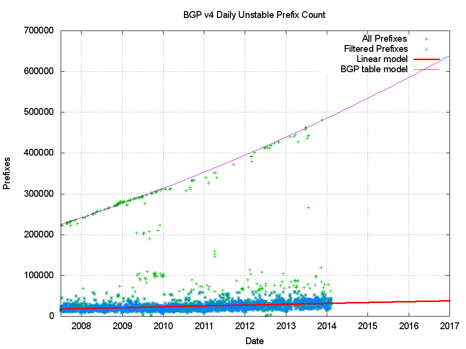 Last month, in January 2014, I reported on the size of the Internet’s inter-domain routing table, and looked at some projection models for the size of the default-free zone in the coming years. At present these projections are looking at relatively modest levels of growth of some 7 – 8% per year with IPv4. Although IPv6 is growing at a faster rate, doubling in size every two years, its relatively modest size of 1/30th of the size of the IPv4 routing table does not give cause for concern at the moment. But size of not the only metric of the scale of the routing space – it’s also what BGP does with this information that matters. As the routing table increases in size do we see a corresponding increase in the number of updates generated by BGP as it attempts to converge? What can we see when we look a the profile of dynamic updates within BGP, and can we make some projections here about the likely future for BGP?