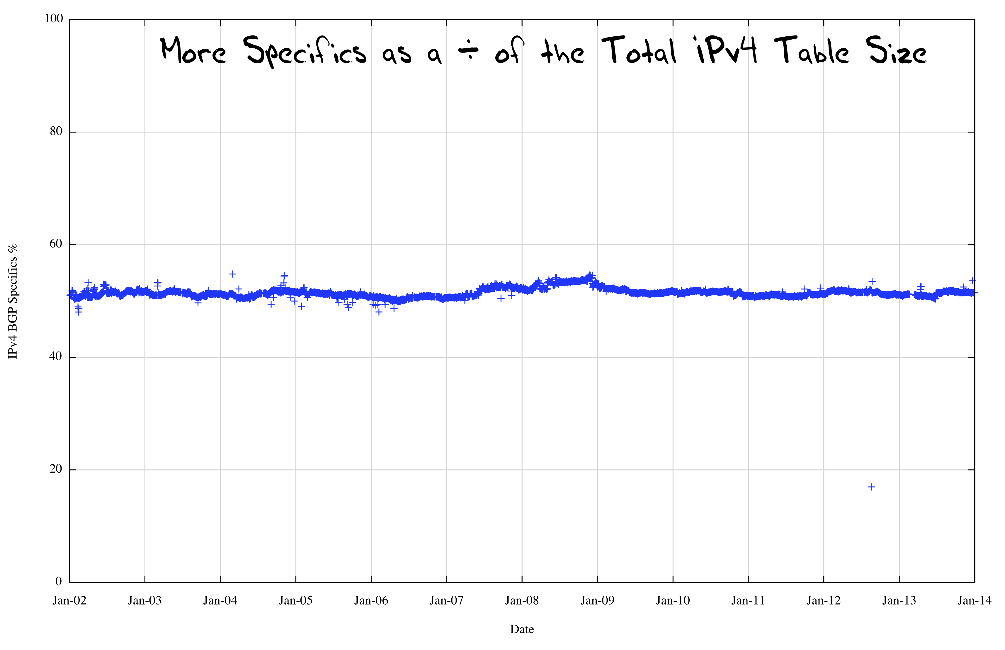 Figure 11 shows the last decade of the routing table history, showing the number of more specifics as well as the total table size. It is clear that the two time series are closely tracking each other. When we re-plot this to show the more specifics as a fraction of the total table size (Figure 12) we see the somewhat unexpected result that the number of more specifics in the IPv4 Internet has remained at a very stable 50 % of the total table size for the past decade.
