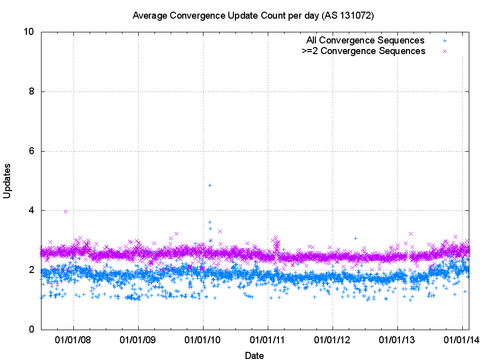 It is also evident that the increase in updates in 2013, shown in Figure 3, is not the result in some underlying change in the model of routing instability in the Internet, but is more likely a result of the addition of a new upstream provider to the observation AS, and this additional transit AS is adding some further component of update activity for each basic root cause event.