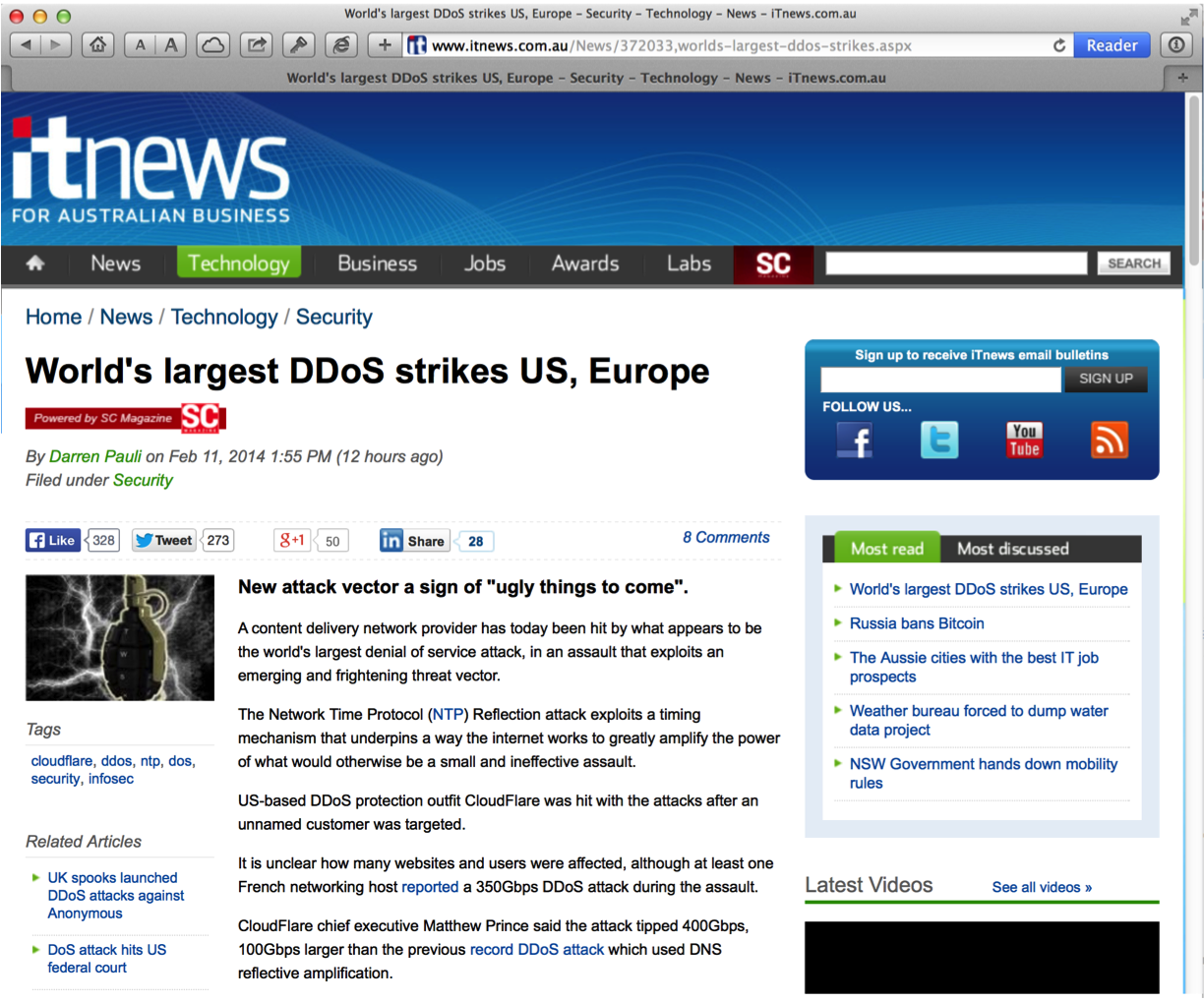 There was a story that was distributed around the newswire services at the start of February this year, reporting that we had just encountered the “biggest DDOS attack ever”. This dubious distinction was as a result of the observation that this time around the attack volume got to 400Gbps of traffic, some 100Gbps more than the March 2013 DNS-based Spamhaus attack).
