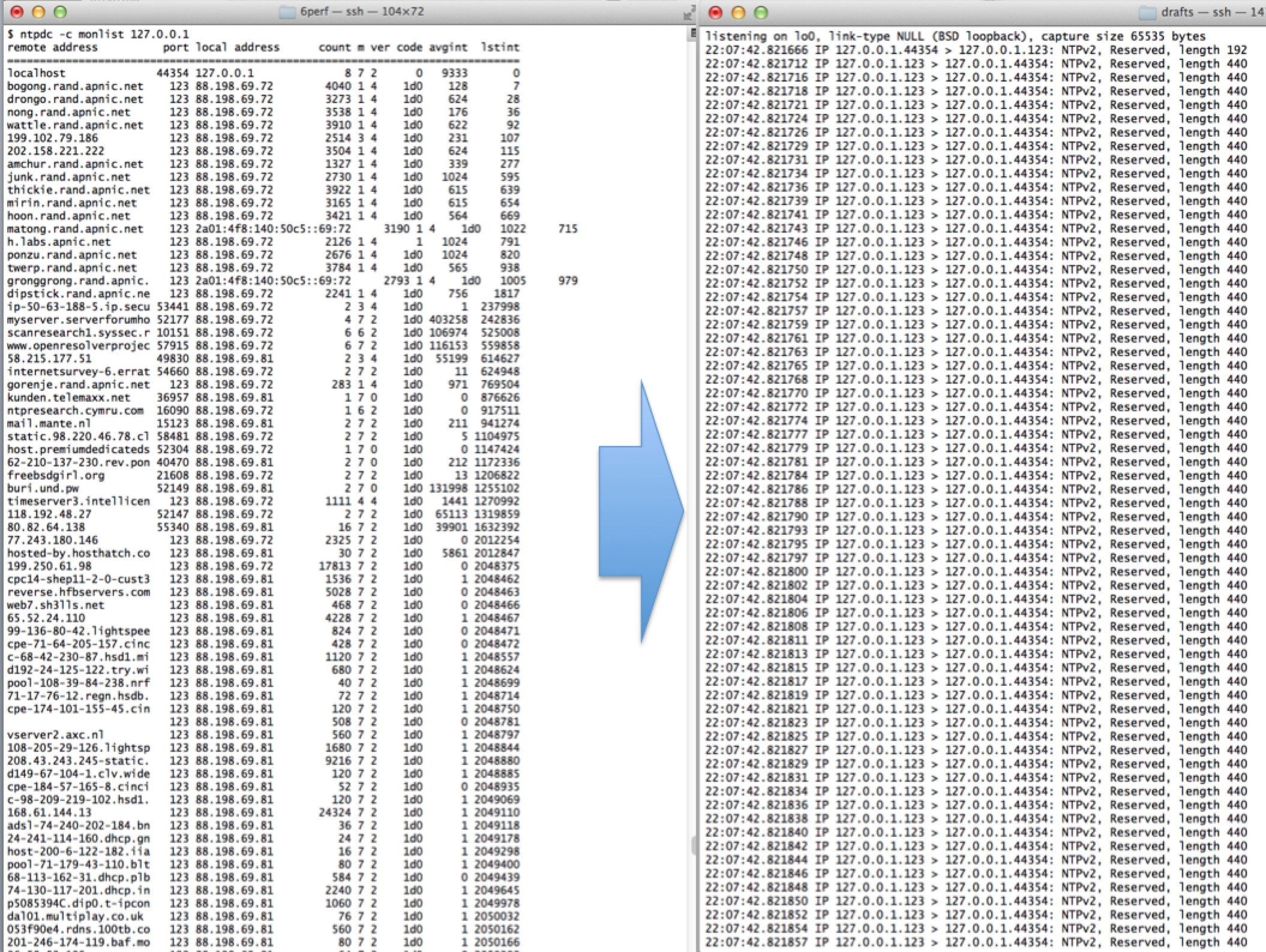 But there is one weakness in NTP. NTP supports a query and control channel so that an NTP server can be managed remotely. The utility is called ntpdc and it takes a user command, converts into a NTP type 7 UDP packet, and send this packet to the NTP server using UDP and addressed to port 123. This is the same port as conventional clock synchronization traffic, so the conventional network-visible outer packet headers do not readily show the distinction between clock synchronization packets and these NTP type 7 packets. The NTP server will respond in UDP with its response. Unlike DNS, the response is conventionally broken into multiple packets, rather than relying on IP level fragmentation. NTP has been careful to ensure that configuration commands that are passed to a server using this control mode must contain a pre-configured key, so that hijacking an NTP server using this approach would normally require obtaining knowledge of this key. However, the NTP monitoring commands are read-only commands, and they are unprotected by this NTP authentication mechanism. Without explicit control anyone can send a read-only monitor command to an NTP server, and the NTP server will respond, as it is evidently promiscuous by default.