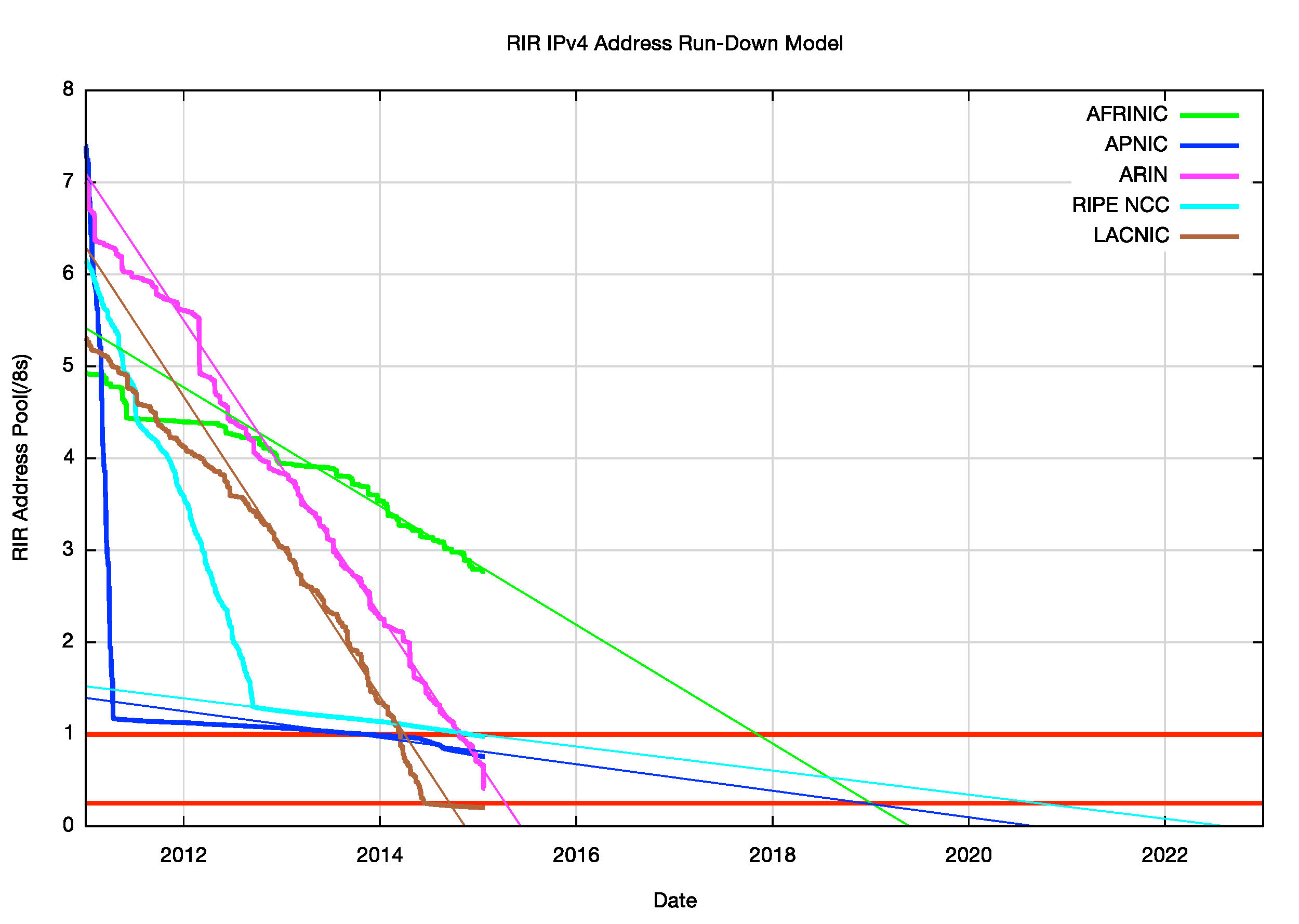 Figure 3 shows the fit of models of address consumption on each of the RIR’s recent assignments. These figures indicate that ARIN has just a small number of months remaining before the registry exhausts its respective remaining address pool. A more detailed analysis of the situation taking into account the dispersal of the remaining IANA-held addresses leads to a current prediction of exhaustion for ARIN in late April 2015. At the current rates of address allocation the AFRINIC registry will not exhaust its address pool in 2019.