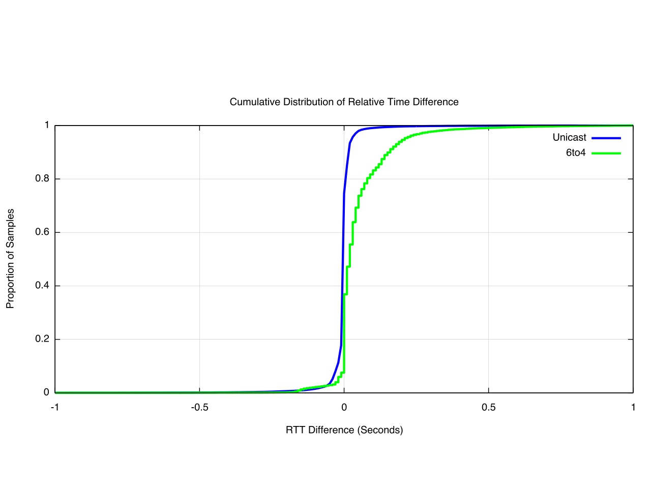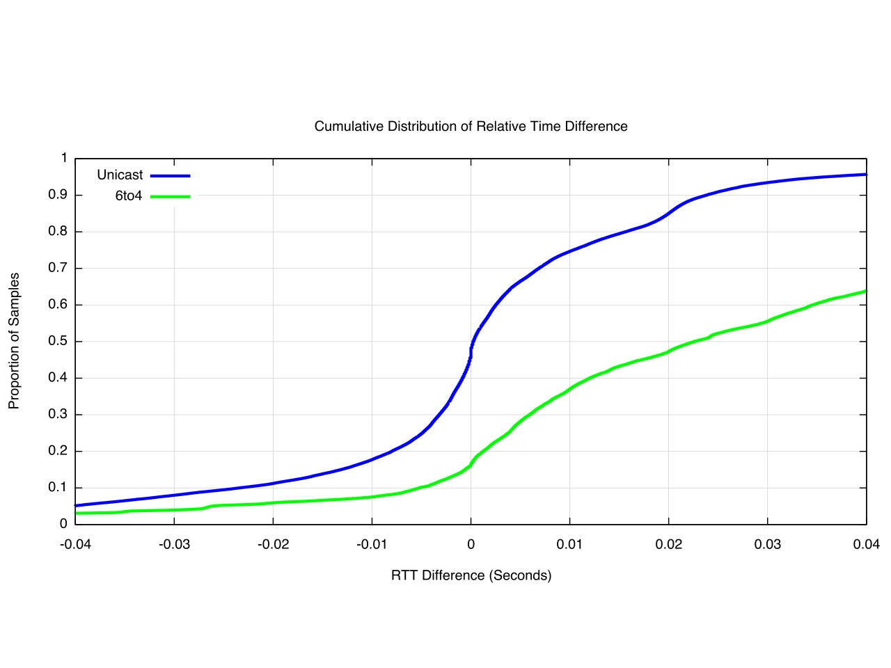 The Unicast IPv6 RTT is faster than IPv4 for 48% of the time, but more than 10ms faster only 18% of the time. Similarly, the Unicast IPv6 RTT is slower than IPv4 for 51% of the time, and is more than 10ms slower 25% of the time.