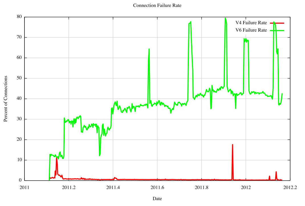 Figure 2 shows the daily connection failure rate across 2011, comparing IPv4 and IPv6. It’s striking that IPv6 was so bad at establishing connections, with a consistent record of some 40% of all connection attempts failing to complete. By comparison, the IPv4 failure rate was some 0.4%