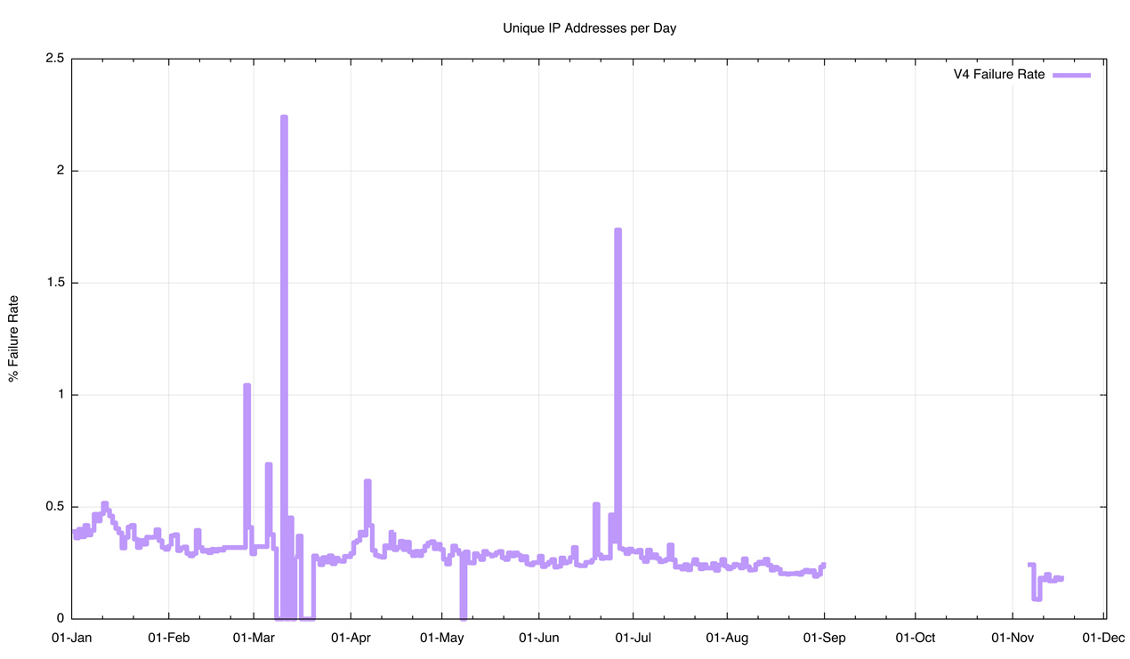 The IPv4 connection failure rate shows a steady decline over the year (Figure 6). The connection failure rate by mid November 2015 was 0.18%.