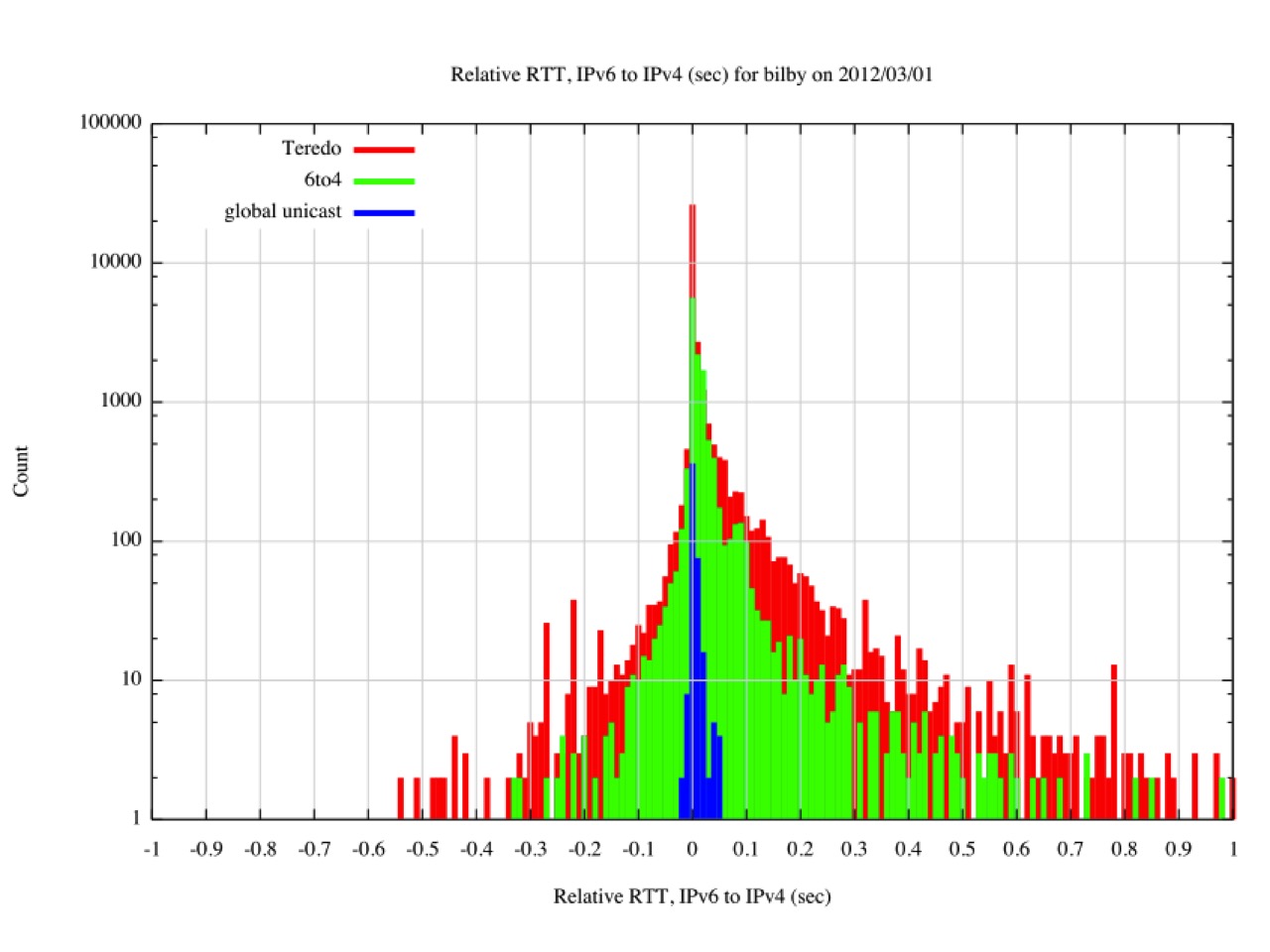 This relative RTT measurement was conducted in March 2012, with the result shown in Figure 9. Points to the right of the centre line are where IPv4 is faster, and to the left where IPv6 is faster. The pairs are differentiated whether the IPv6 address shows as a Teredo address, a 6to4 address, or a unicast address. The unicast IPv6 measurements clustered around the midpoint, with a smaller number of samples where the IPv6 time was up to 50ms slower than the IPv4 equivalent. IPv6 tunnelling was predominately slower than IPv4, though what was surprising was the number of cases where the tunnelled measurement was faster then IPv4.