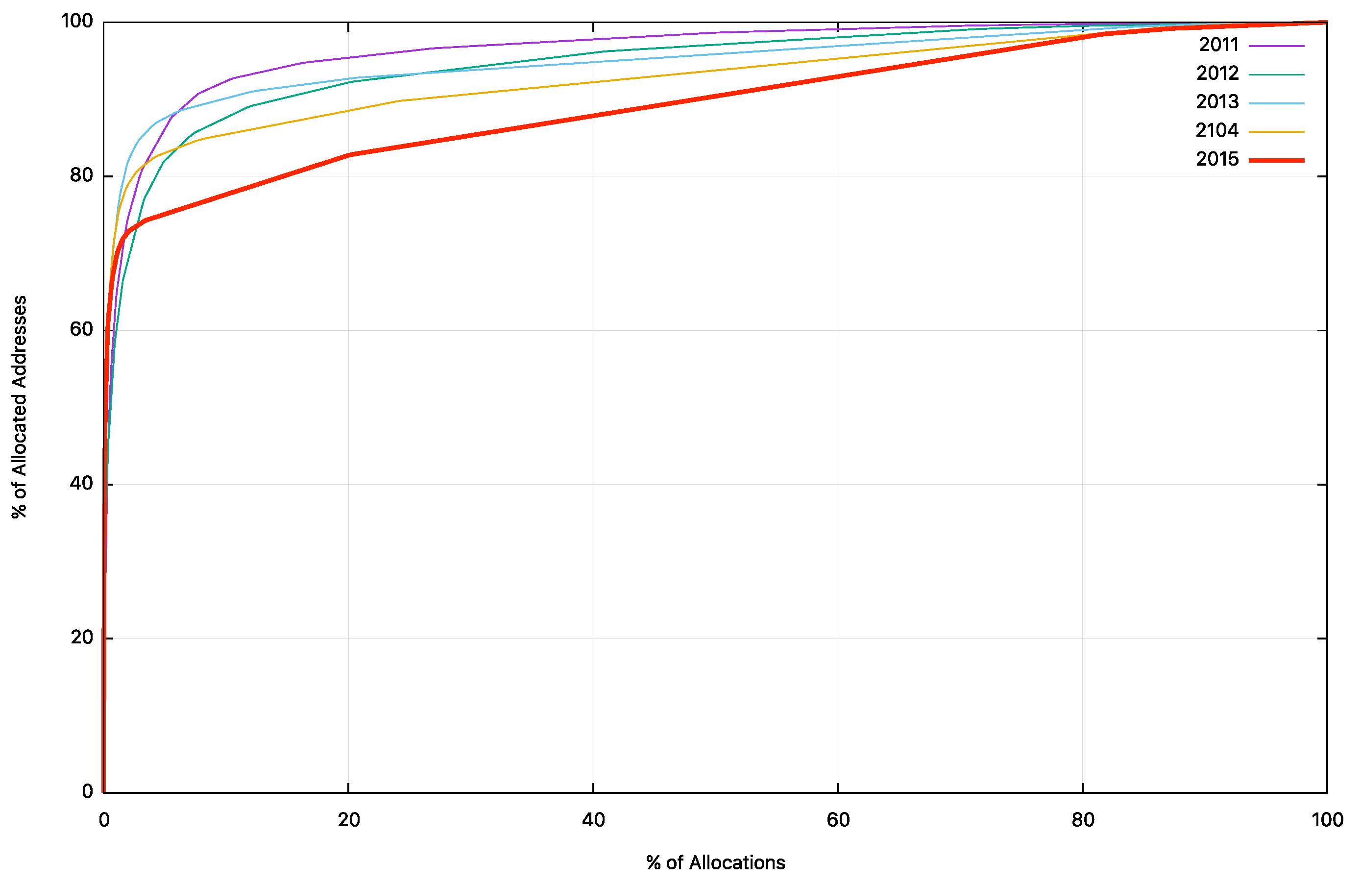 Figure 1 shows the address distribution for the years 2011 through to 2015. The shift over this period shows a relatively steady level in the proportion of address space being allocated to the larger providers. In 2011 one half of all addresses were allocated to 70 entities, while in 2012 80 entities consumed one half of all addresses, and in 2013 68 entities. In 2014 one half of the assigned address space was assigned to 39 entities, while in 2015 one half of all assigned address space was assigned to 21 entities. (Figure 2).