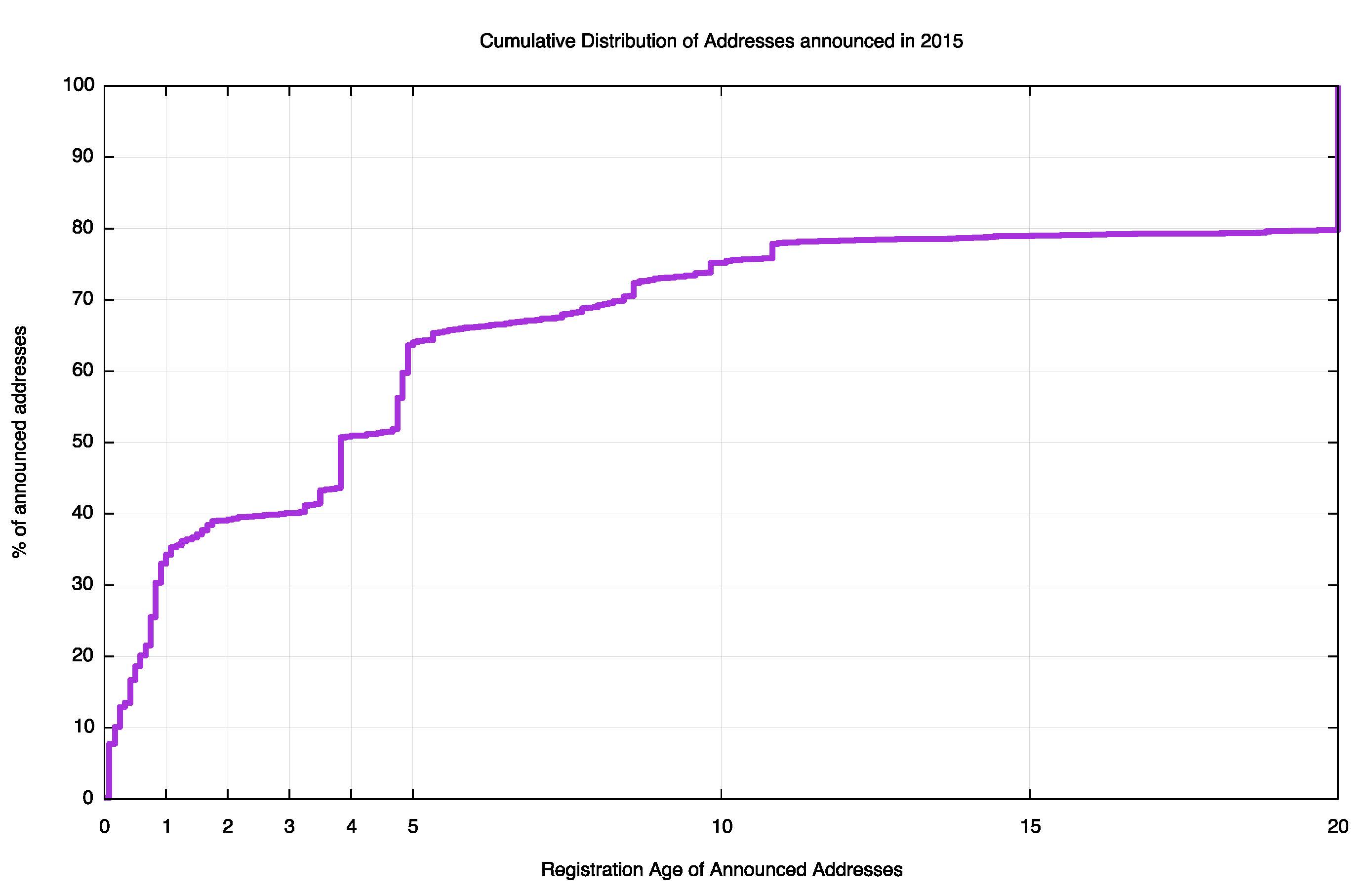 The outstanding question about this transfar data is whether all of the address transfers that occur are duly recorded in the registry system as an address transfer. This question is raised because registered transfers require conformance to registry policies, and it may be the case that only a subset of transfers are being recorded in the registry as a result. One way to shed some further light on this is through a simple examination of the routing system, looking at the relative age of addresses that are announced through each year. Figure 4 shows the results of a simple analysis of the addresses present in the routing table at the end of 2015 that were not present in the same table at the start of the year. While this is admittedly a very simple technique, it does show that in 2015 some 20% of the address advertisements of addresses that were present at the end of 2014, but not at the start of the year have a registration date of 1995 or earlier (i.e. 20 years old or older.