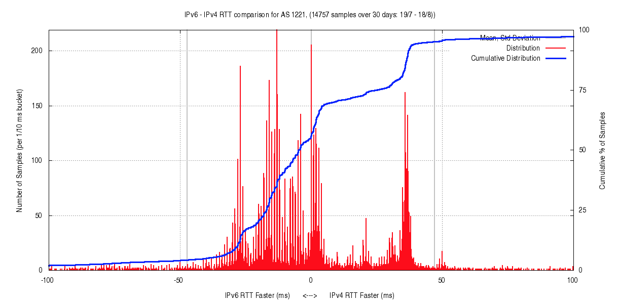 This distribution shows a level of variation in RTT measurements that is not visible in the average value, nor in the mean standard deviation. In this case shown in Figure 4, there is a local peak of some 1,000 sample points where the IPv4 path is some 40ms faster than the equivalent IPv6 path. In this case slightly more than 50% of the samples show a faster path using IPv6, with some clustering at 10ms and 24ms.