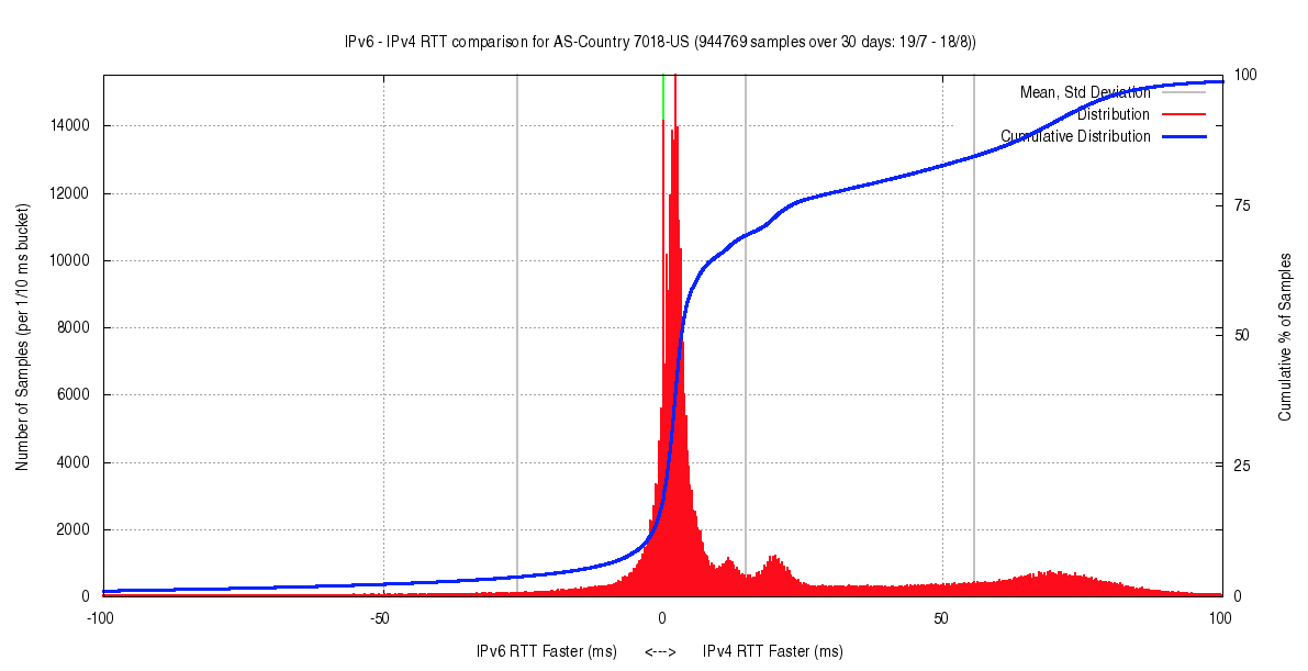 AS7018 in the United States (AT&T Services) shows an interesting distribution (Figure 5). Slightly over one half of the samples show IPv6 being no slower than 10ms than the accompanying IPv4 RTT value. However, there are three local clusters where IPv6 is respectively 15ms, 25ms and 75ms slower.