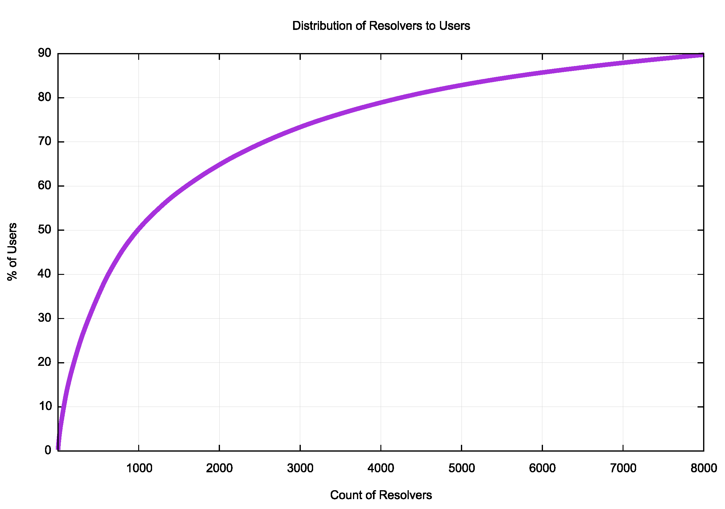It is evident that some 8,000 visible resolvers (by IP address) handle 90% of the users’ experiment queries. (It should be noted that the number of actual resolvers handling this load is smaller than this 8,000 number, as the number of unique IP addresses querying authoritative name servers does not take into account DNS resolver farms, such as that operated by Google in their Public DNS service, or by other large multi-headed resolver instances).