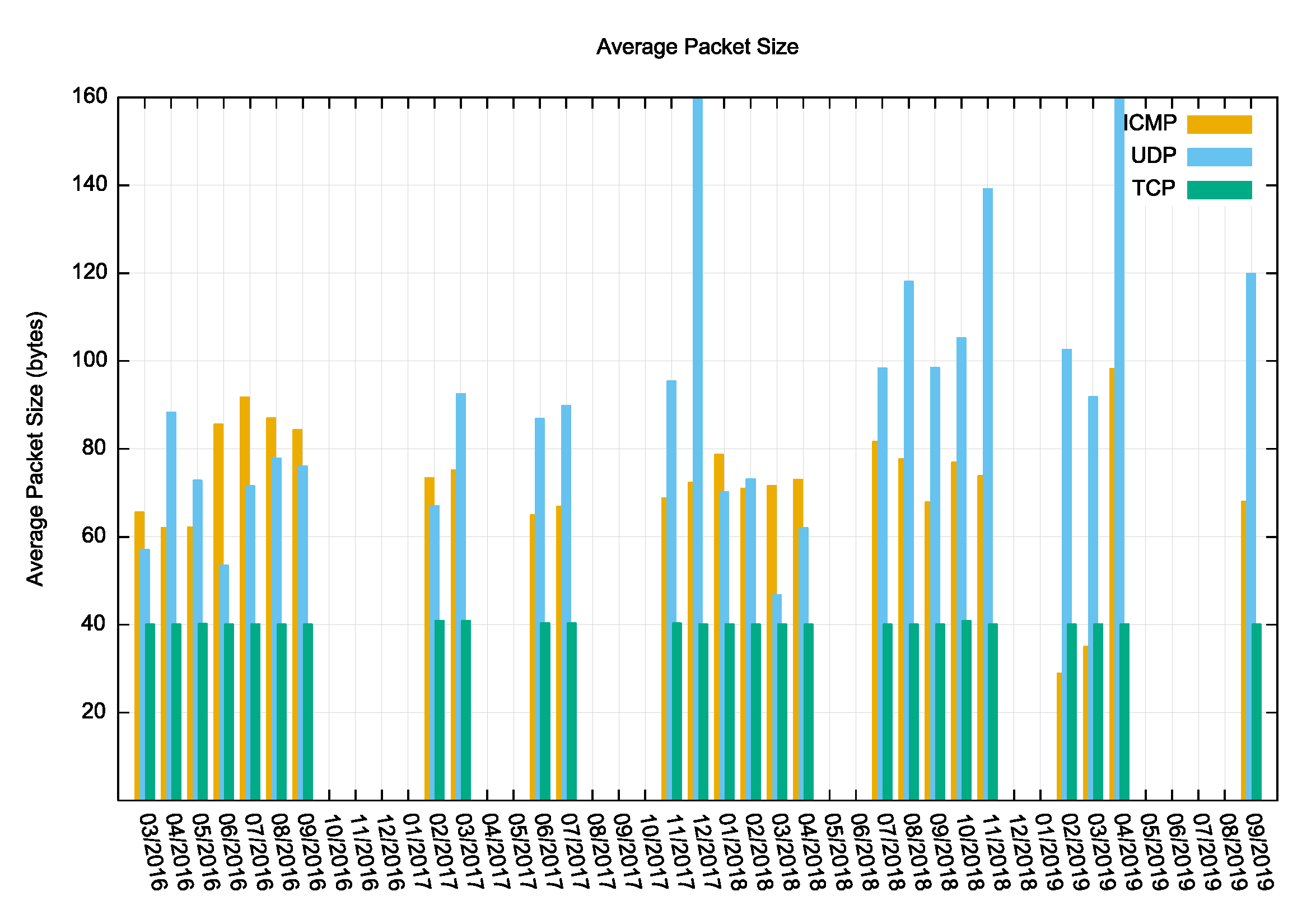 With the exception of two months (December 2017 and April 2019) the UDP traffic rate has been relatively steady, but the average UDP packet size has increased substantially, from an average of 60 to 80 bytes per UDP packet to the most recent monthly average of 120 bytes per packet.