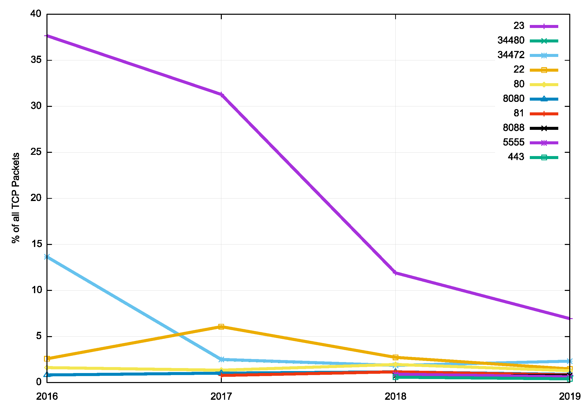 The profile of TCP port numbers has changed over time as well. In 2016 TCP Port 23 (telnet) accounted for more than a third of all TCP packets, whereas by 2019 this port accounted for just 6% of all packets. In 2016 the heaviest used 25 TCP ports accounted for 84% of all TCP packets, yet by 2019 this also dropped to 21% (Figure 6). All TCP port numbers are seen in this traffic collection.