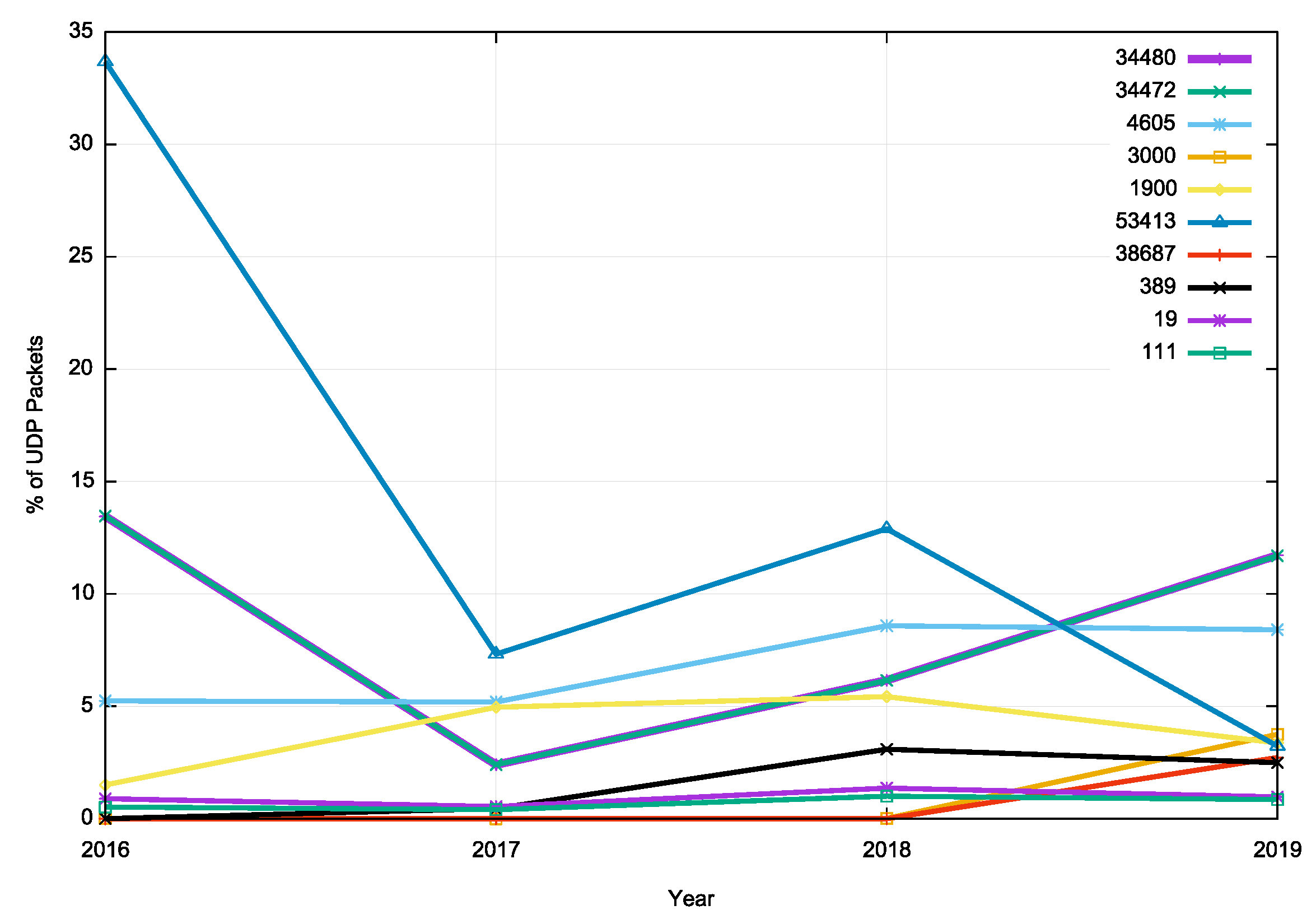 UDP packets have a different profile, as the packets are not necessarily part of an protocol-level handshake as we observe with the 3-way TCP handshake. In 2016 port 53413 accounted for one third of all UDP packets. This has declined and in 2019 the most commonly seen port number is port 34480 (Figure 7). There is a visible level of probing for open UDP ports, namely on port 179 (chargen), port 111 (RPC) and 389 (LDAP) which can be used for DDOS amplification attacks if there is a promiscuous server attached to those UDP ports.