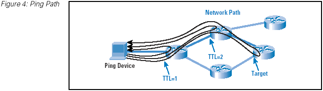 Of course, it is possible to interpret too much from ping results, particularly when pinging routers within a network. Many router architectures use fast switching paths for data packets, whereas the central processing unit of the router may be used to process ping requests. The ping response process may be given a low scheduling priority because router operations represent a more critical router function. It is possible that extended delays and loss, as reported by a ping test, may be related to the processor load or scheduling algorithm of the target router processor rather than to the condition of the network path. (Figure 4)