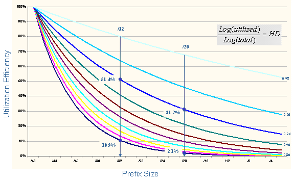 The guiding observation in defining this host density metric is that a service provider network typically use a number of levels of hierarchy. A large service provider metric may divide the address space into regions. Within each region the address space is further divided into network access points, or POPs. Within each POP the address space may be further divided into access classes. Within each access class address pool end-site addresses are assigned. This then defines a four level internal address hierarchy. Smaller networks may have a smaller number of internal levels of hierarchy, perhaps using only one or two levels. Assuming that at any level of the hierarchy a utilization efficiency of, say 0.7 (or 70%) can be achieved, then a two level hierarchy achieves a threshold level of efficiency of 0.49 (or 0.72) and a four level hierarchy would map to 0.24 (or 0.74).