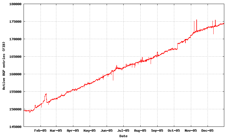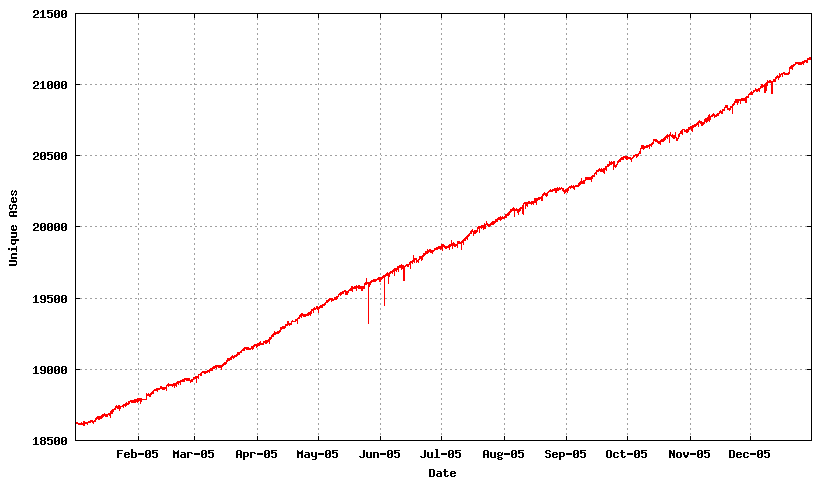 There are a large number of measurements of the BGP routing table that can describe the dimensions and dynamic characteristics of the inter-domain internet. Here I'd like to concentrate on the use and behaviour of the protocol itself, so in this article I will take a look at BGP across the year of 2005, and see how well BGP fared.
