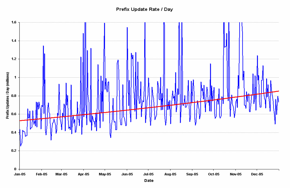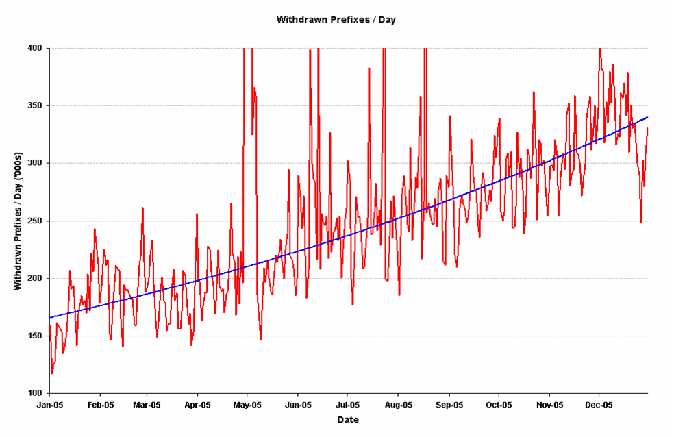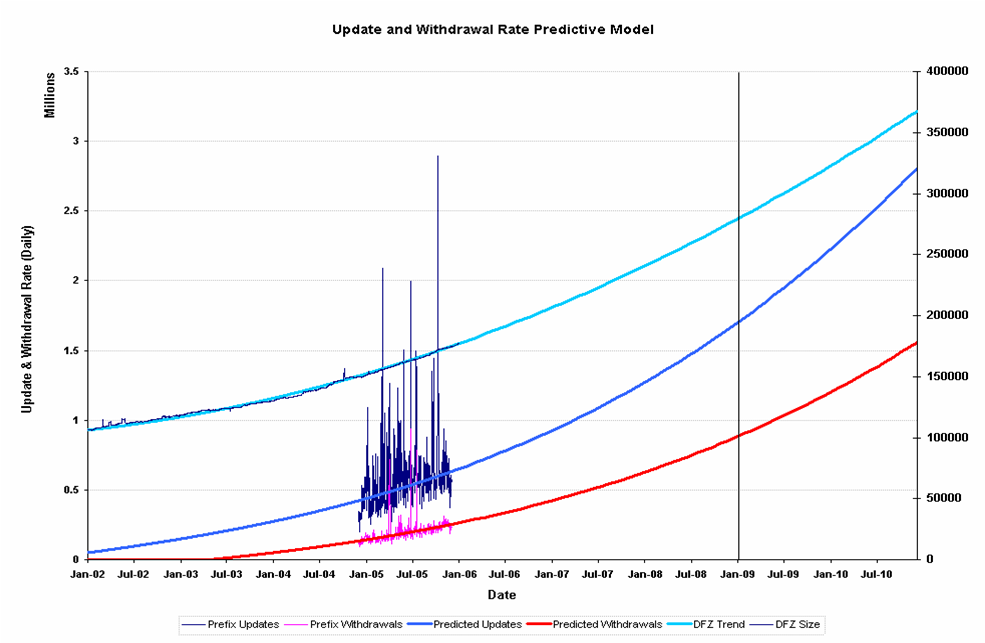 Date BGP Table Size Daily Prefix Updates Daily Prefix Withdrawals End 2005 176,000 700,000 400,000 End 2008 275,000 1,700,000 900,000 End 2010 370,000 2,800,000 1,600,000